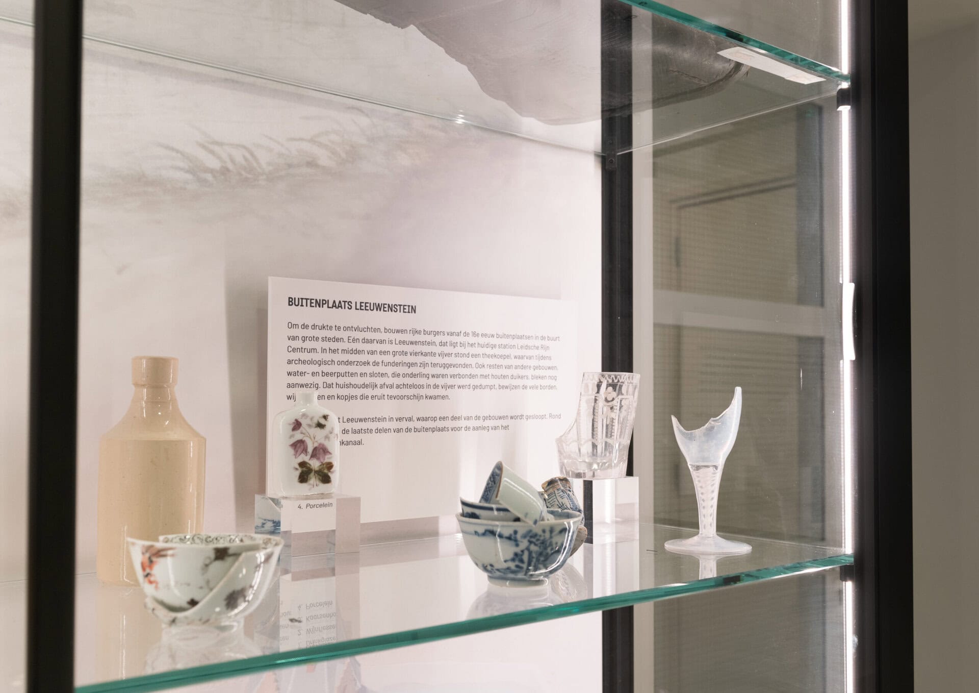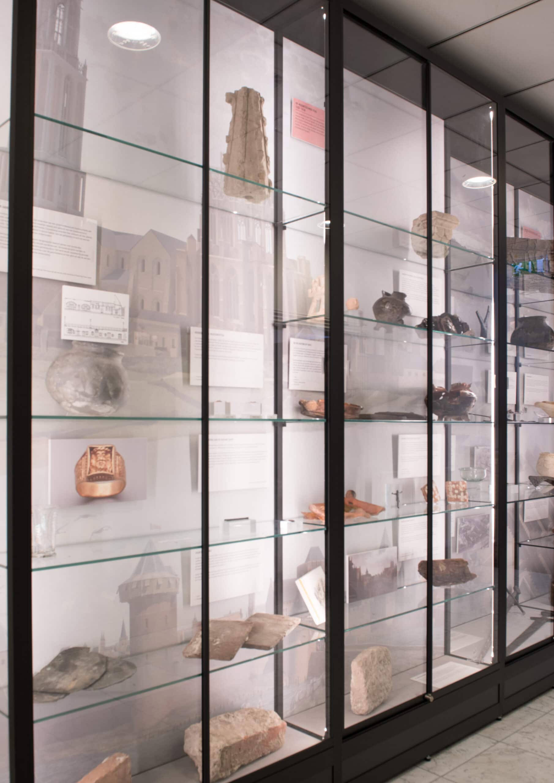 “Dat geldt ook voor de vitrine in de lunchkamer”, vervolgt Daan. “Die sluit naadloos aan tot aan het plafond, terwijl een bestaande balk erdoorheen loopt. Het is echt maatwerk. Bij de transparante wand in de werkruimte zit het unieke in de kleine led-spots. Die kunnen we precies op de archeologische vondsten richten. Dat is ideaal, want de kast is dus helemaal open. Zo kunnen we de objecten van alle kanten goed uitlichten, zonder dat er licht hinderlijk in de ogen schijnt.”